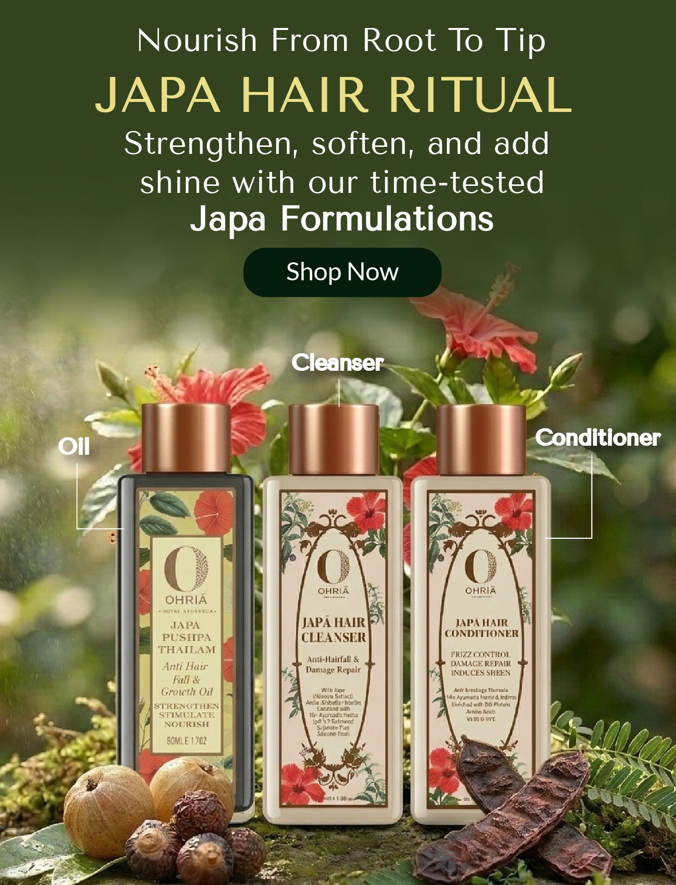 Japa Pushpa Thaliam: Ohria Ayurveda Japa Pushpa Thailam, a modified NeeliBhringadi Oil with Hibiscus, Indian Jujube, and Kalonji, curbs hair fall, nourishes, and delays graying for lustrous, healthy hair.