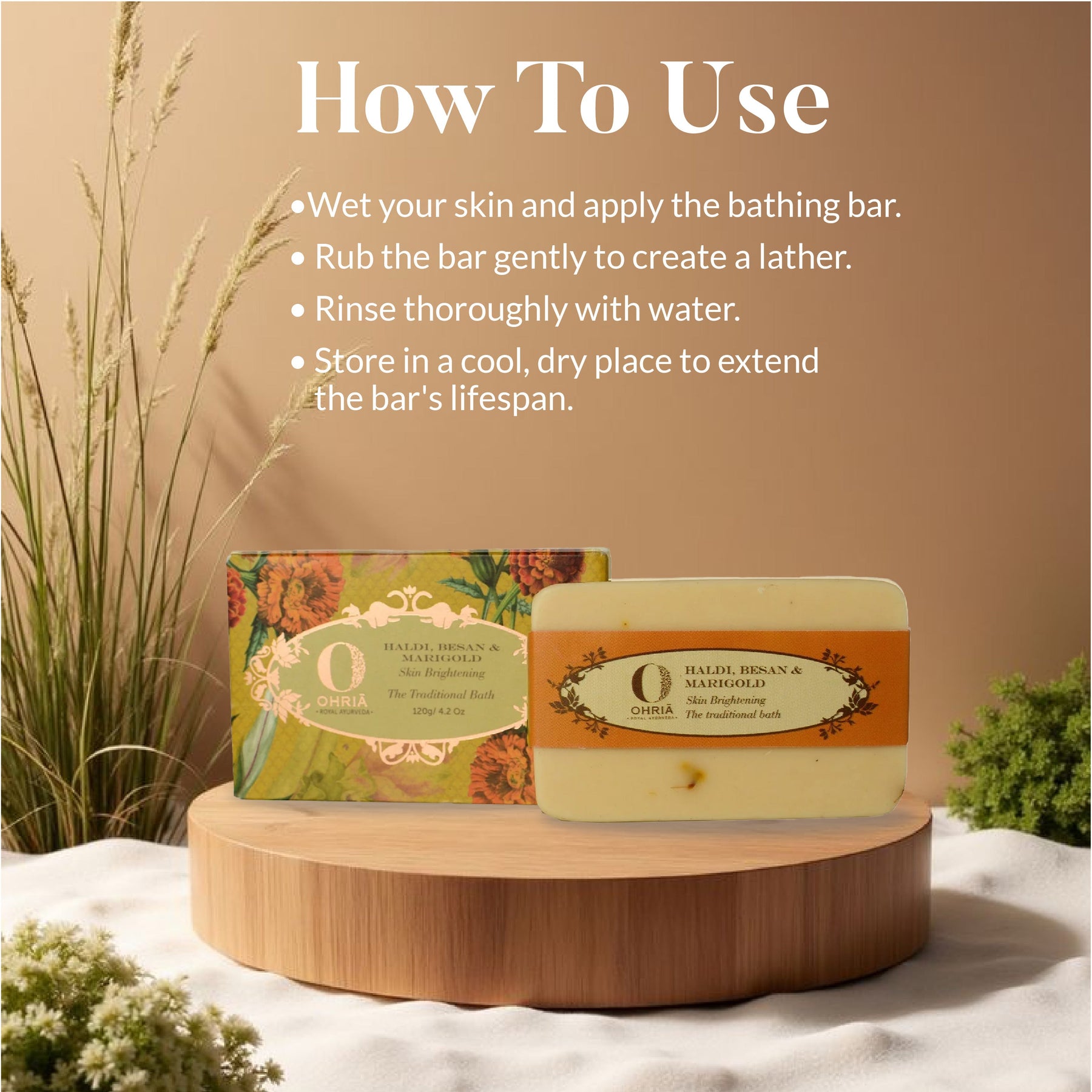 This lovingly handcrafted bathing bar is suitable for all skin types and is designed to brighten the skin while enhancing your complexion. Formulated with natural cleansing and moisturizing ingredients such as turmeric, besan (gram flour), goat milk, lentils, and Sveta Chandan oil, it effectively reduces pigmentation and heals blemishes. Enriched with Vitamin E, turmeric oil, castor oil, palm oil, and coconut butter, the bar deeply hydrates and moisturizes the skin, leaving it soft, supple, and clear. These powerful Ayurvedic ingredients purify the skin and provide a luxurious, traditional bathing experience.
