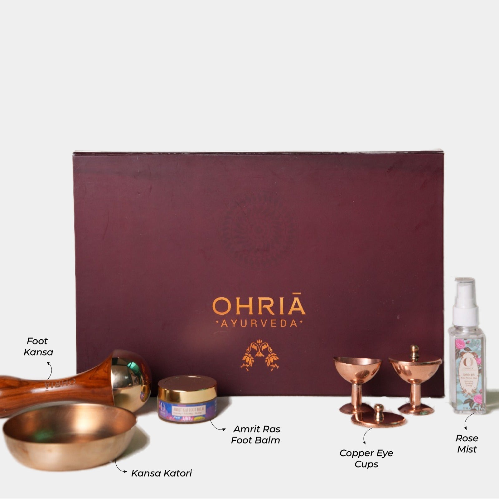 The Foot Kansa paired with the rich Amrit Ras Foot Balm grounds and deeply nourishes, releasing fatigue and instilling a sense of renewal. The Copper Eye Cups offer a cooling respite from strain, easing puffiness and tension, while the Kansa Katori along with the delicate mist of pure Rose Water uplifts and refreshes, reviving the delicate eye and facial area, awakening a natural glow from within.