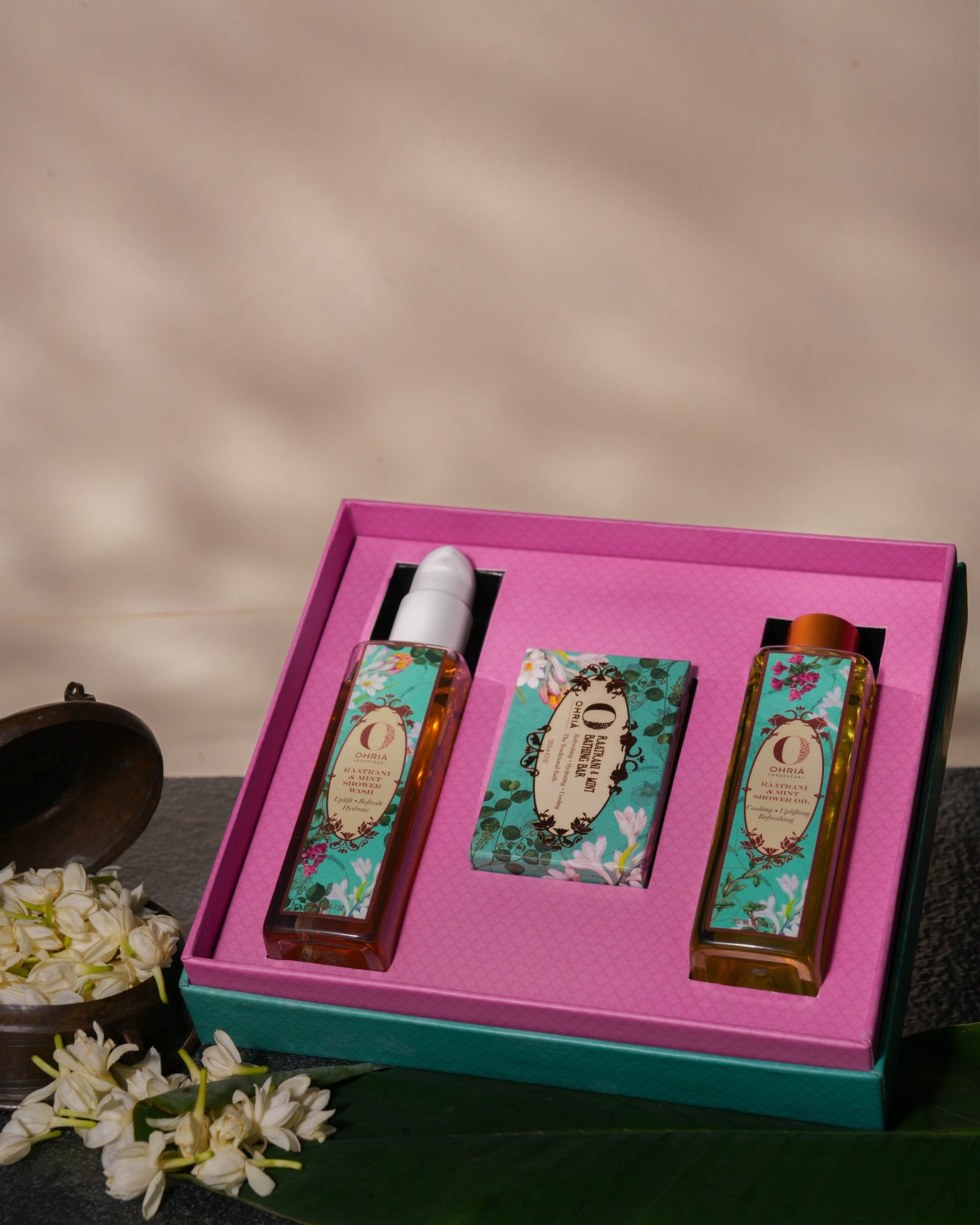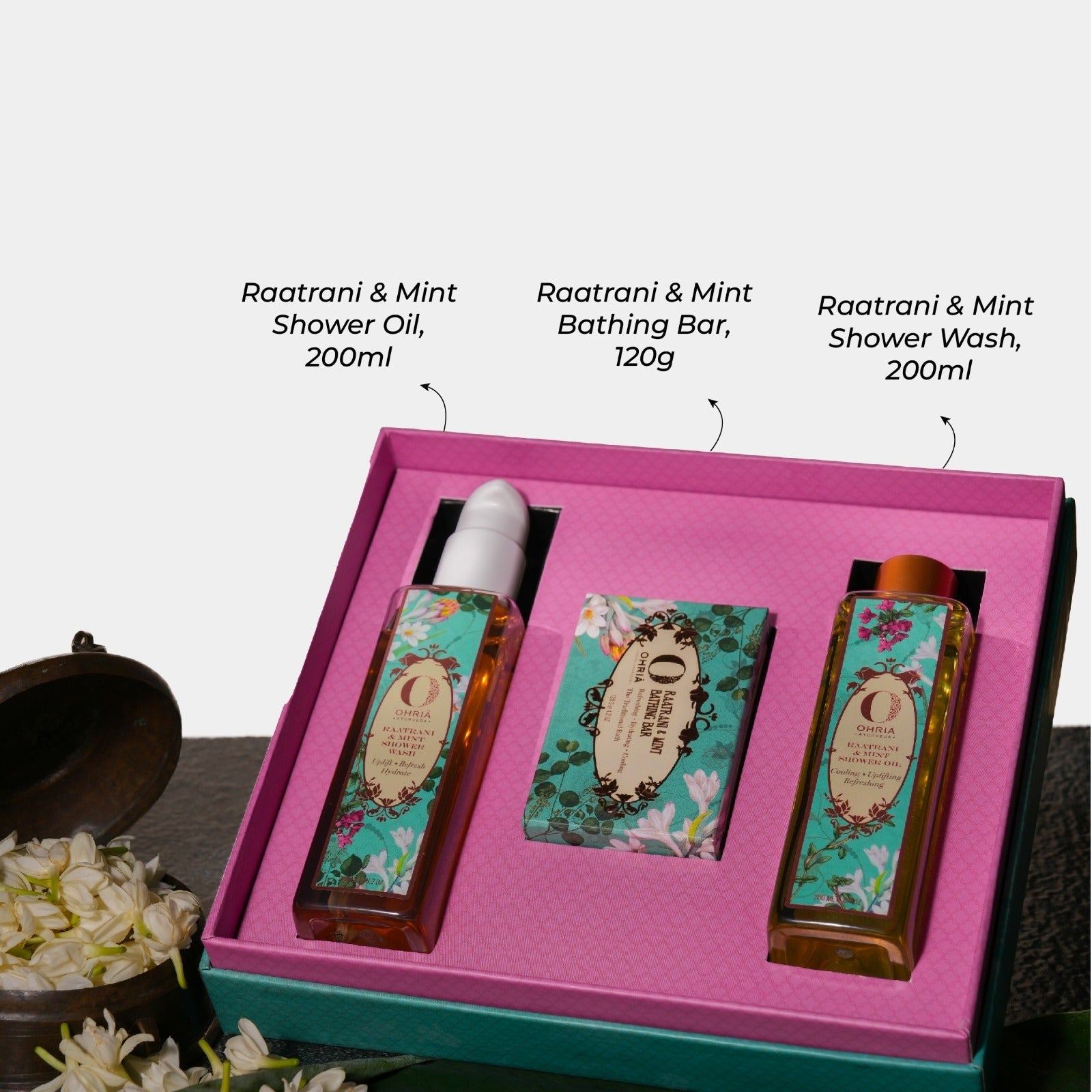Awaken the senses with a refreshing ritual inspired by the intoxicating bloom of Raatrani and the cooling touch of Mint. This indulgent trio—Shower Wash, Bathing Bar, and Shower Oil—gently cleanses, hydrates, and rejuvenates, enveloping the skin in a lingering floral-cool fragrance. A soothing blend of freshness and allure, crafted for everyday self-care or as a gift of pure indulgence.