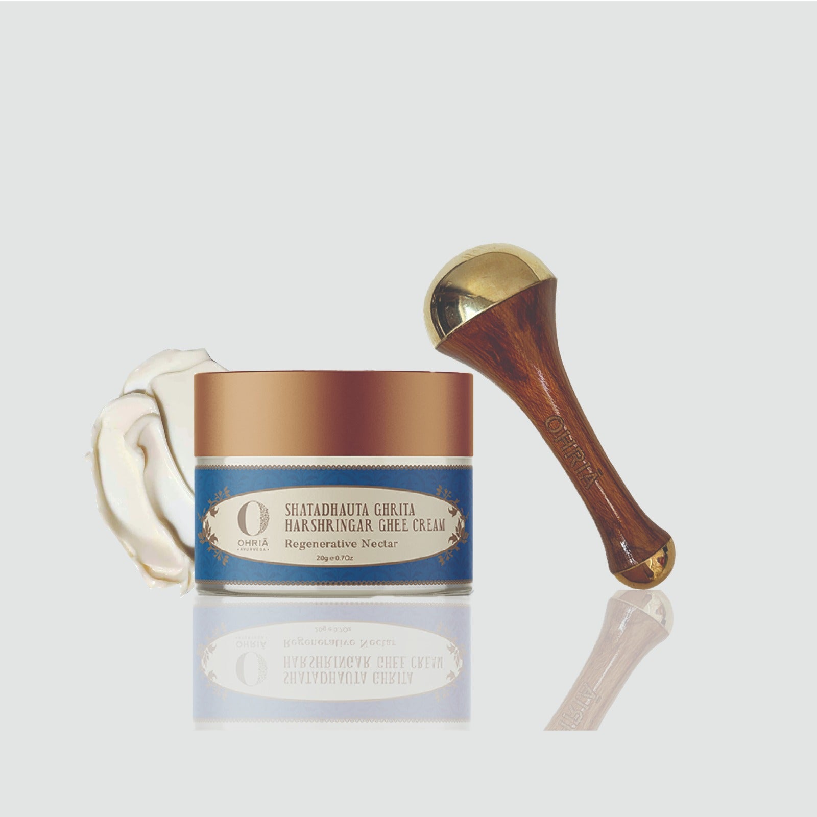 For radiant, youthful skin, indulge in a massage ritual with Ohria’s Ghee Cream and the Kansa Face Wand.